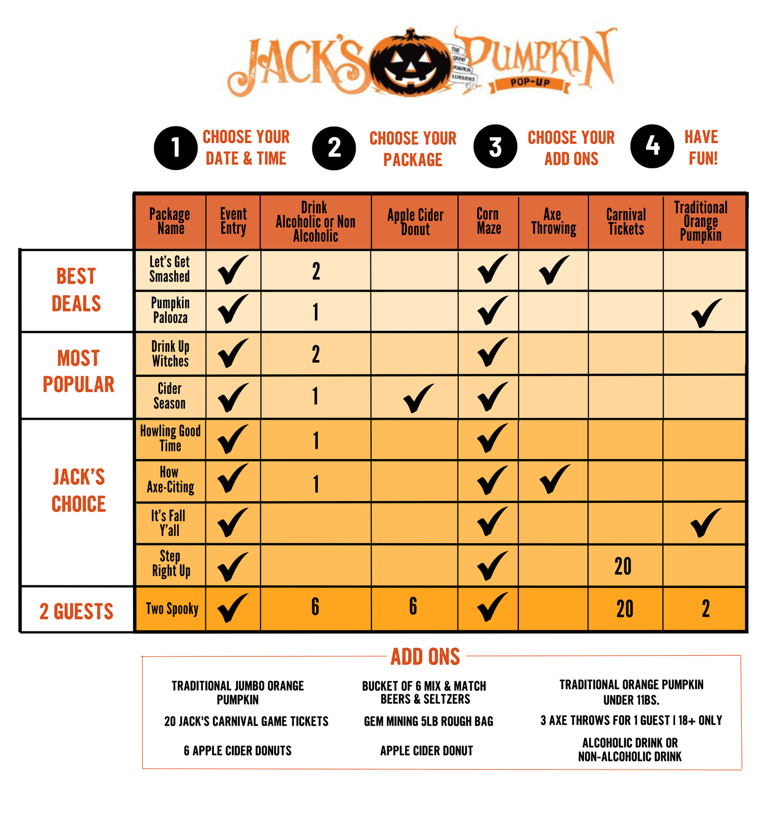 Gain access to Jack’s Pumpkin Pop-Up! Children aged 4 and under enjoy free entry with a paid adult ticket, while those aged 5 and up need a package to enter. We offer a special kids ticket for ages 5-11. When you snag a "Two Spooky" package, you'll get 2 entries, plus all package perks. Please note re-entry isn't permitted, but you're welcome to stay as long as you wish.